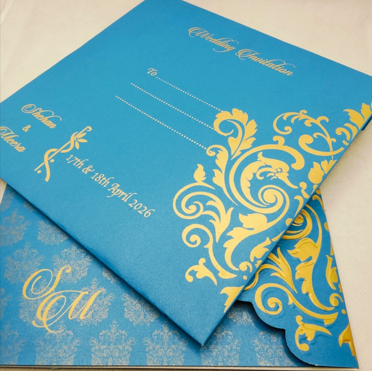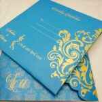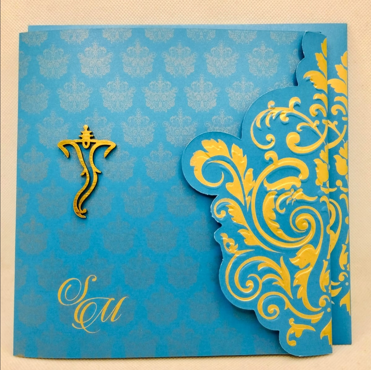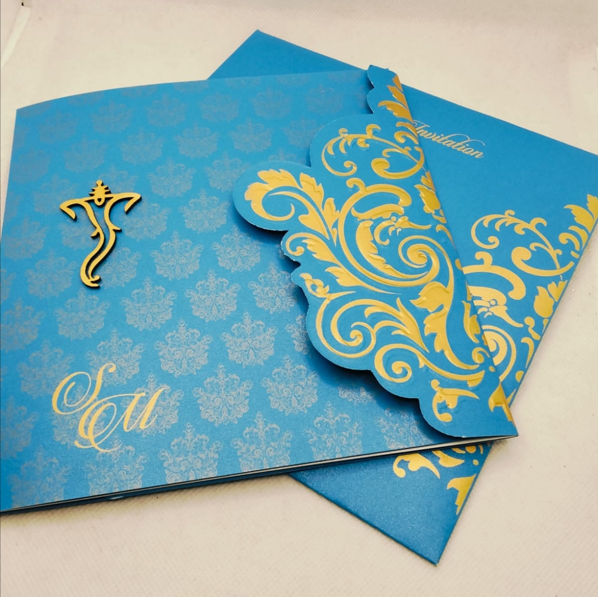Blue colour wedding invitation is one of our elegant design. This invitation card is made out of blue textured board with matching shimmer paper envelope. Card has a rich gold embossed,water mark design and laser cut ganesh logo(Please note, this logo can be changed to any symbol or couple initial as per your preference). The card has two inserts with coordinated printed designs.