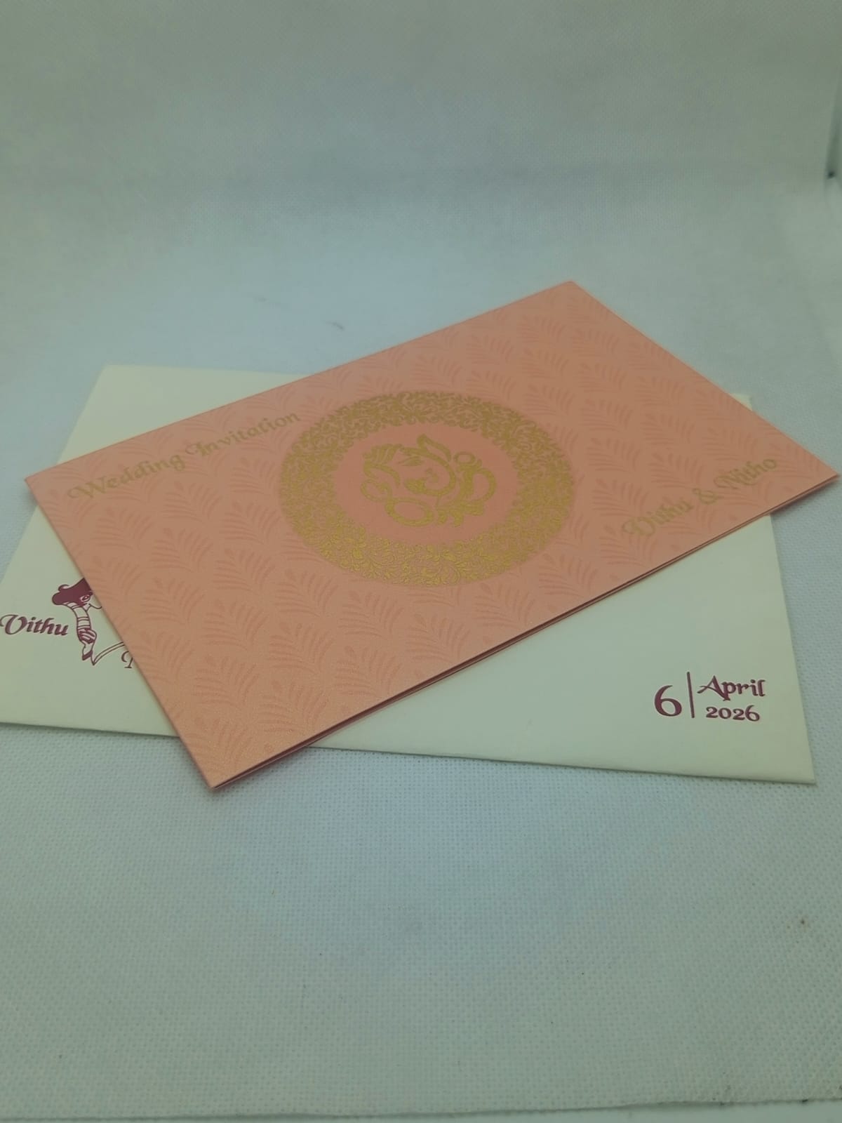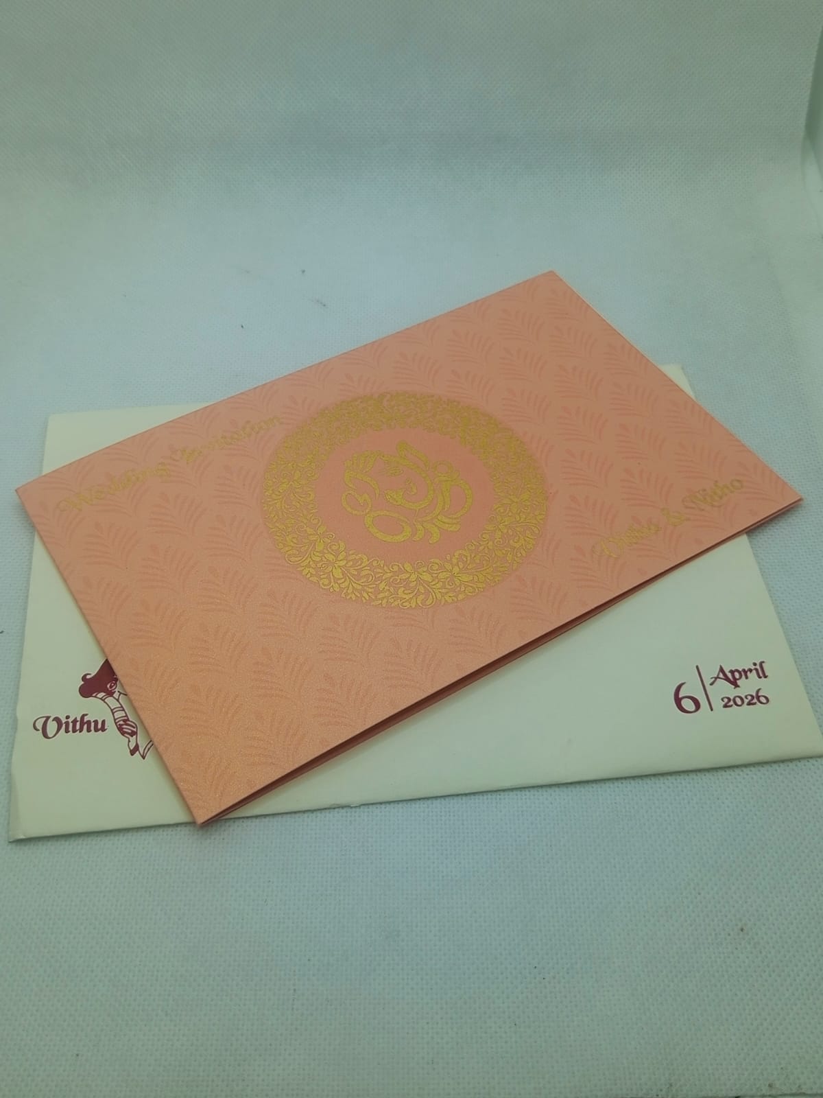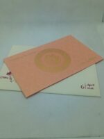 Circle flower design peach wedding invitation is one of our elegant design. This invitation card is made out of peach textured board with matching paper envelope. Card has a peach watermark design, Circle flower design and ganesh logo gold ink screen print. (Please note, this logo can be changed to any symbol or couple initial as per your preference). The card has two inserts with coordinated printed designs.