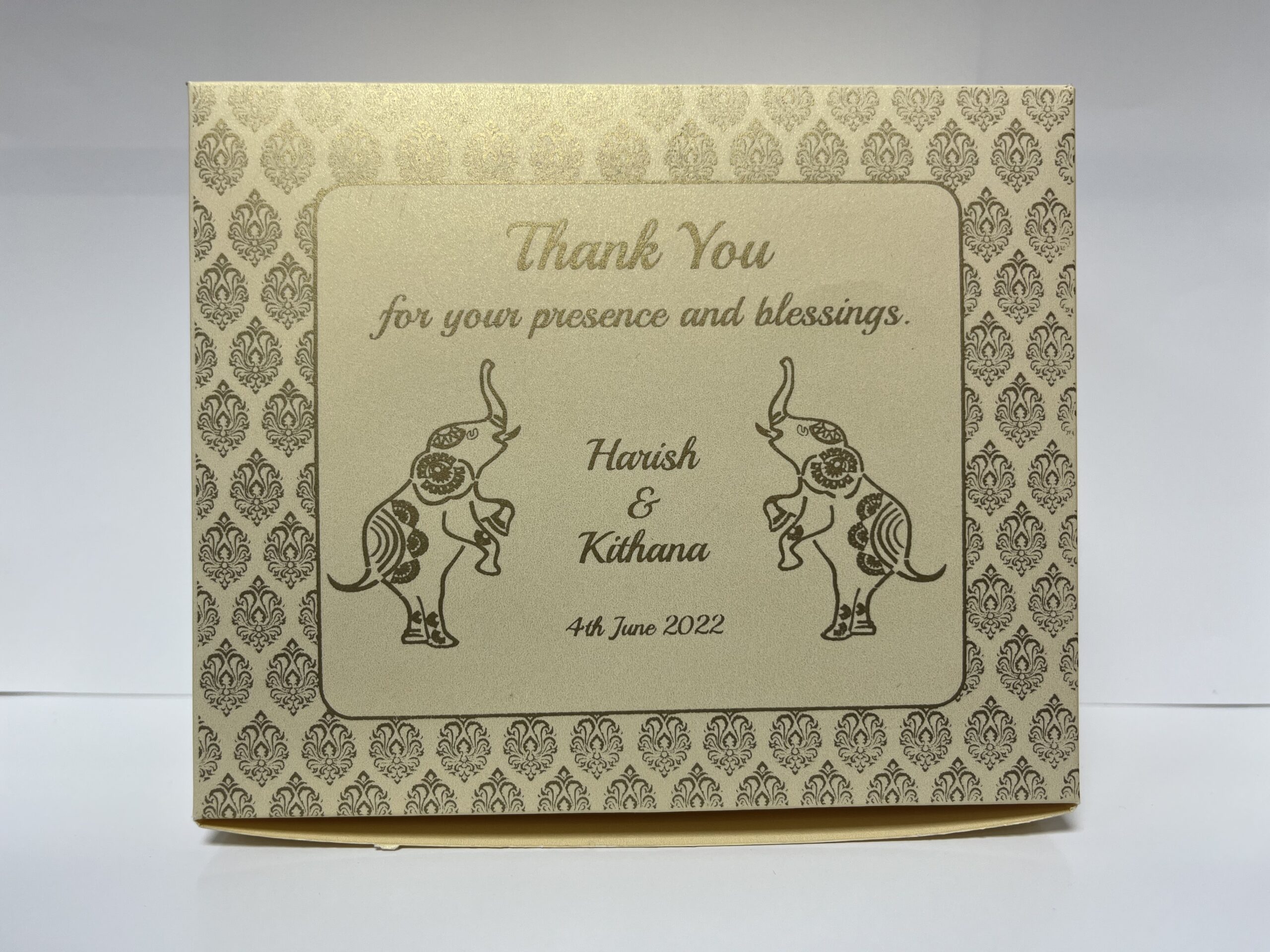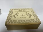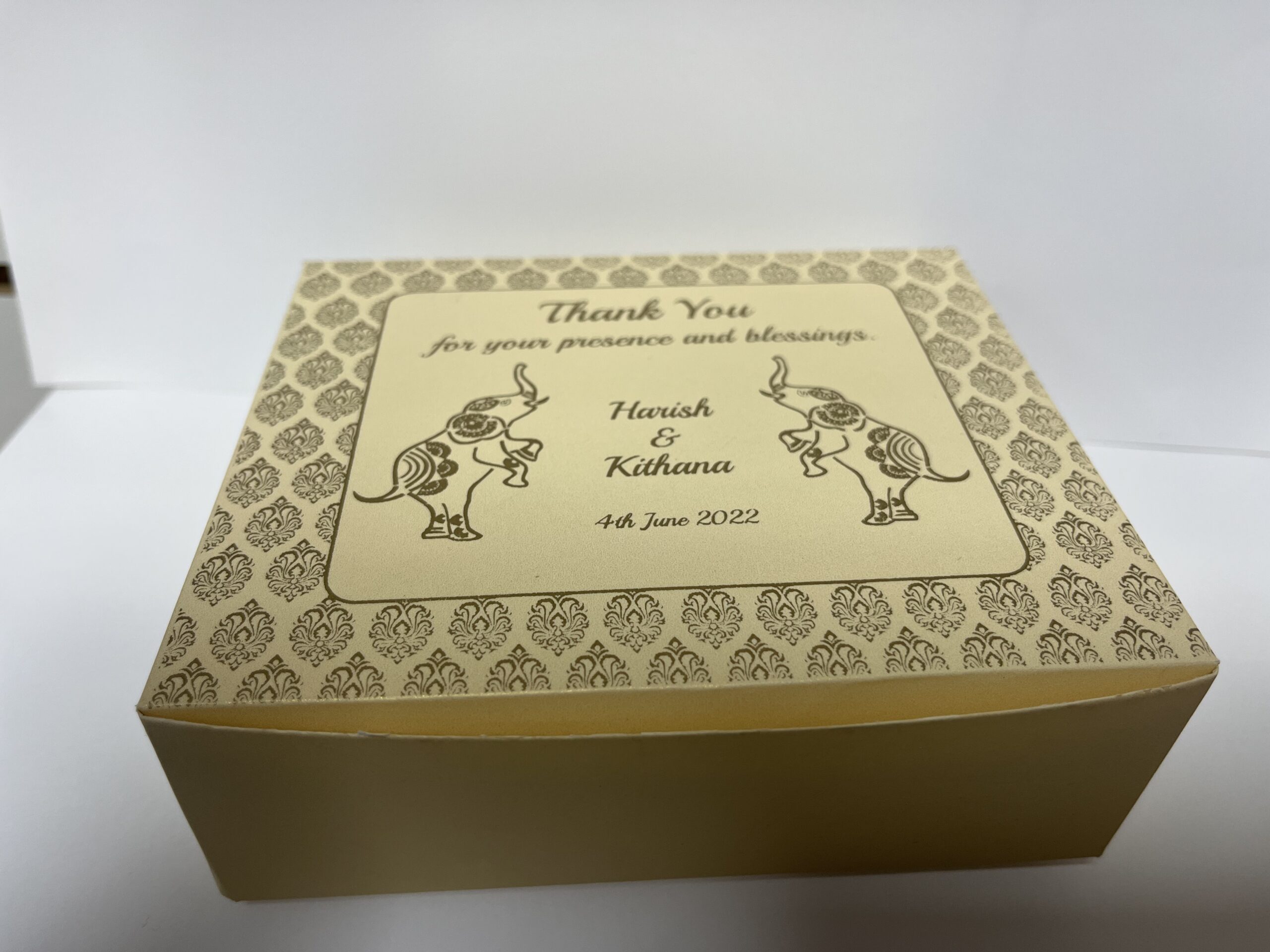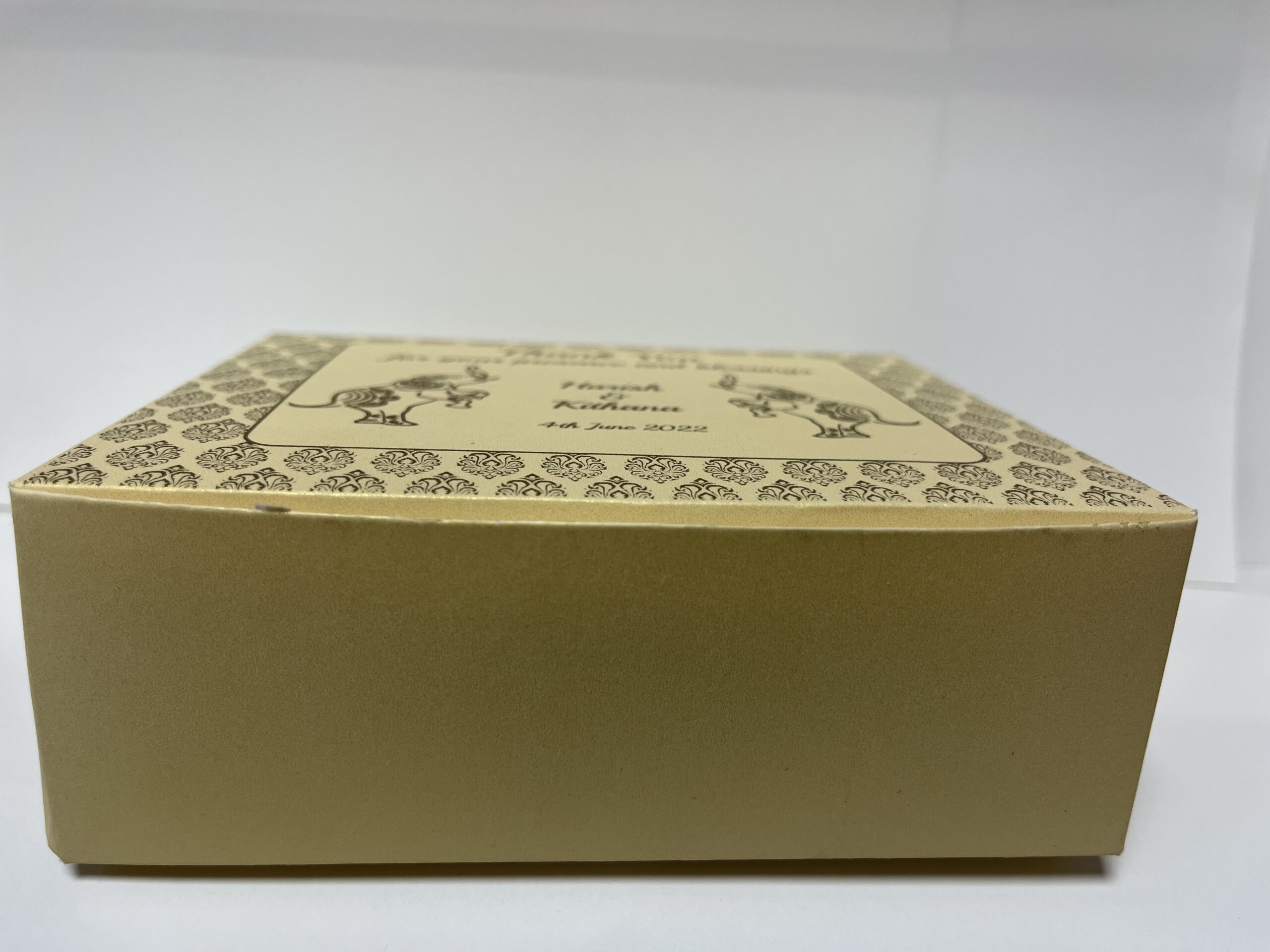 Cream and gold design snack box is one of the cutest that we produce. This snack box is made out of cream shimmer board. Snack box top has a design and Text in gold ink.