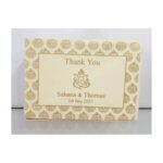 Cream colour small snack box is one of the cutest  that we produce.This snack box is made out of Off cream matt paperboard. Snack box top has a design and couple name printed in Gold ink.