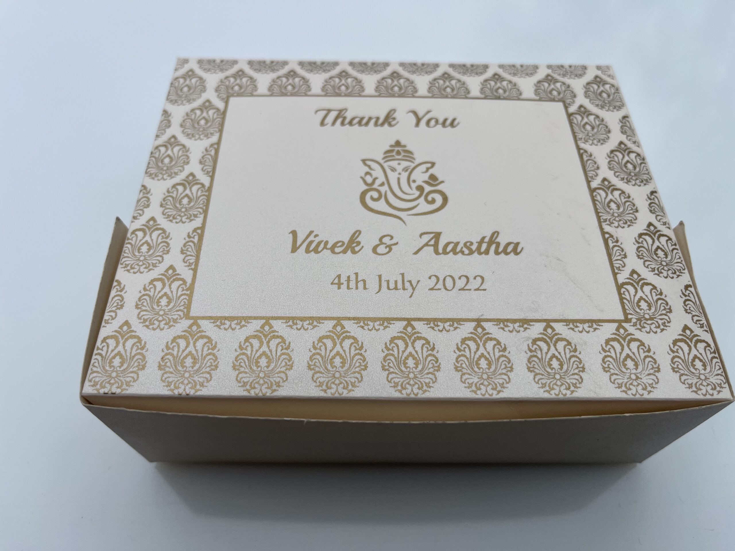 Cream colour palakaara box is one of the beautiful design. This snack box is made out of cream shimmer board. Snack box top has a design ganesh logo and couple name printed in gold ink.