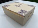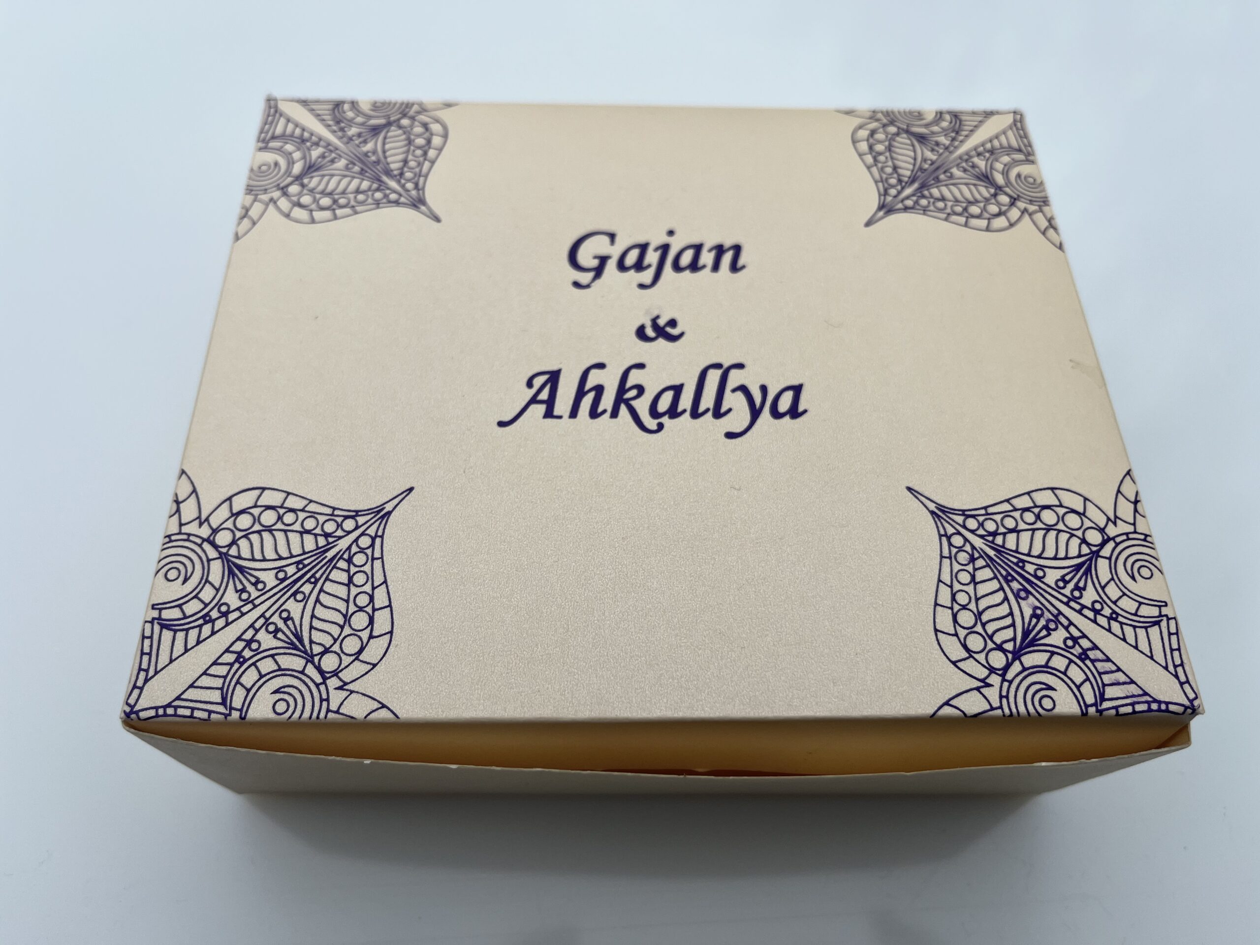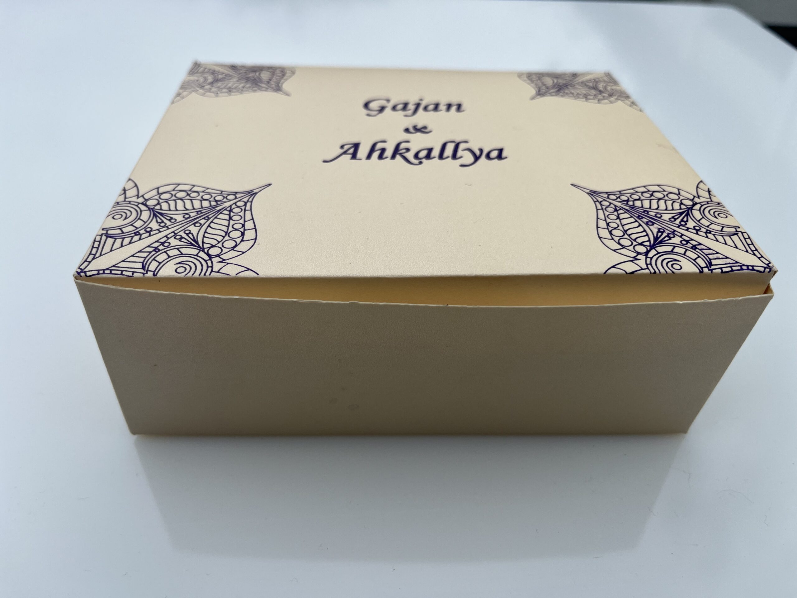 Cream colour palakara box is one of the cutest that we produce. This snack box is made out of cream shimmer board. Snack box top has a design and Text in blue ink.