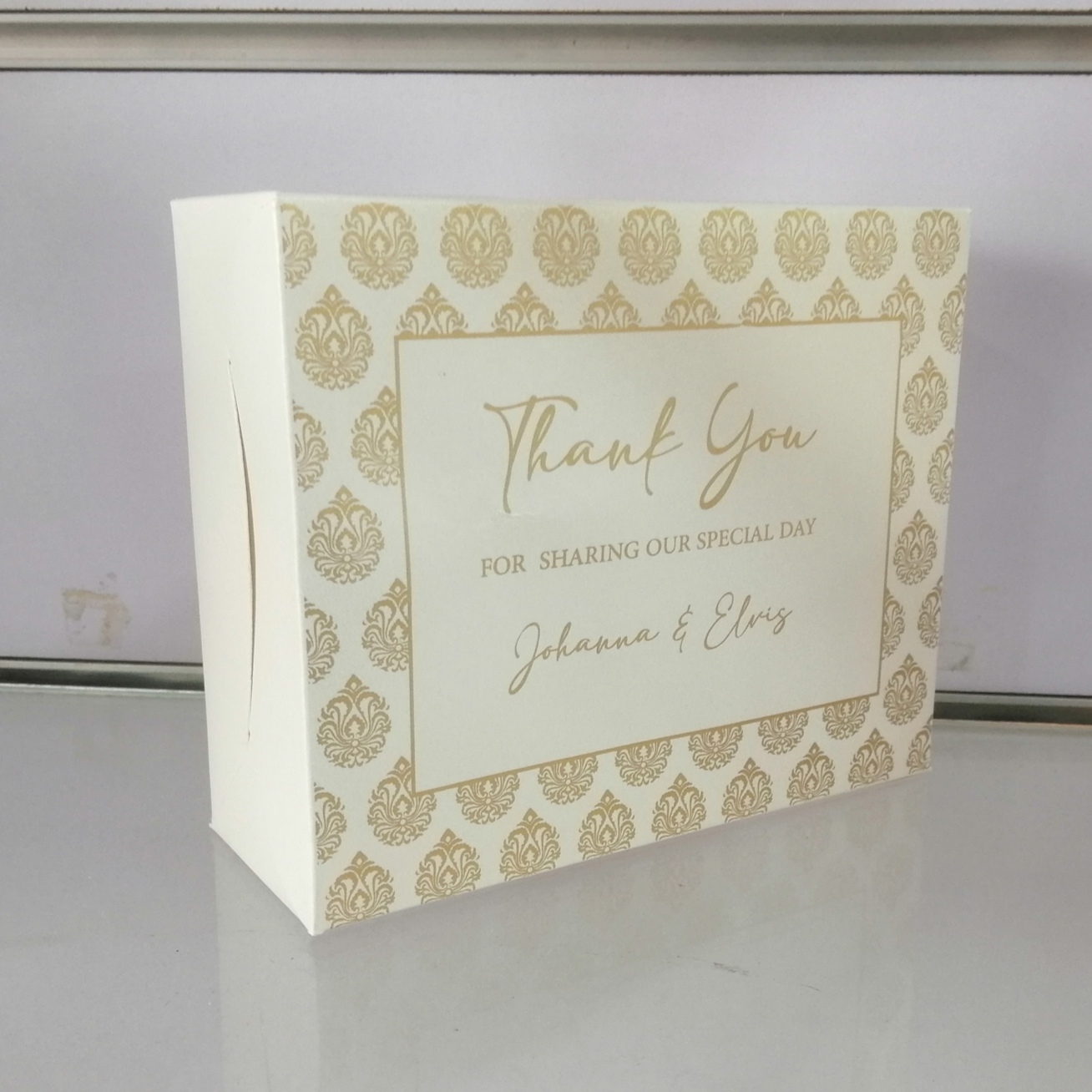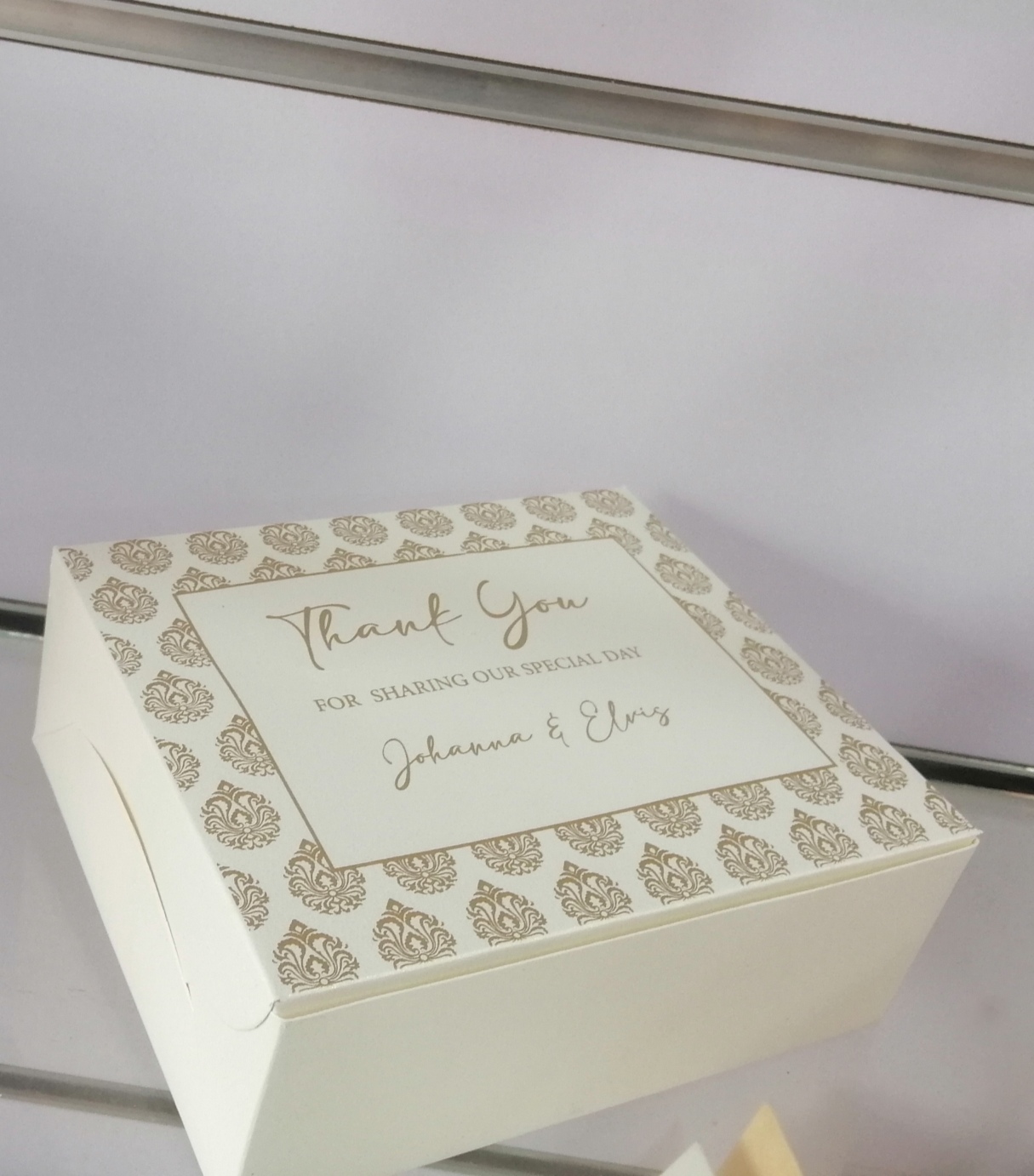 Cream Colour Snack Box is one of the cutest that we produce. This snack box is made out of cream board. Snack box top has a design and text in gold ink.