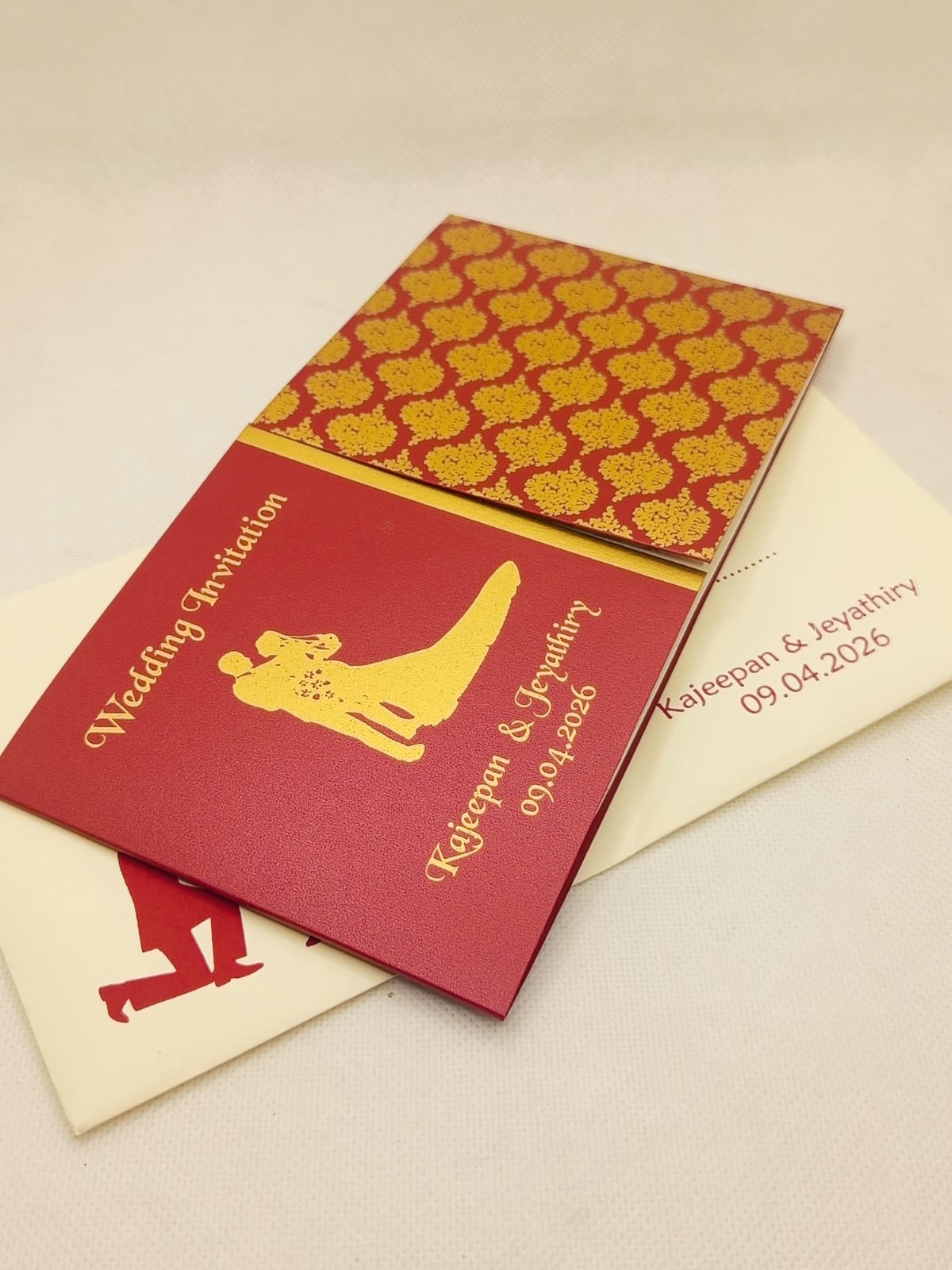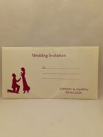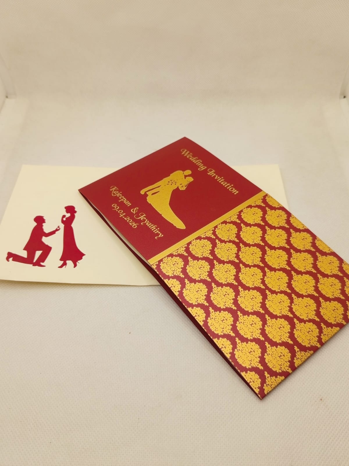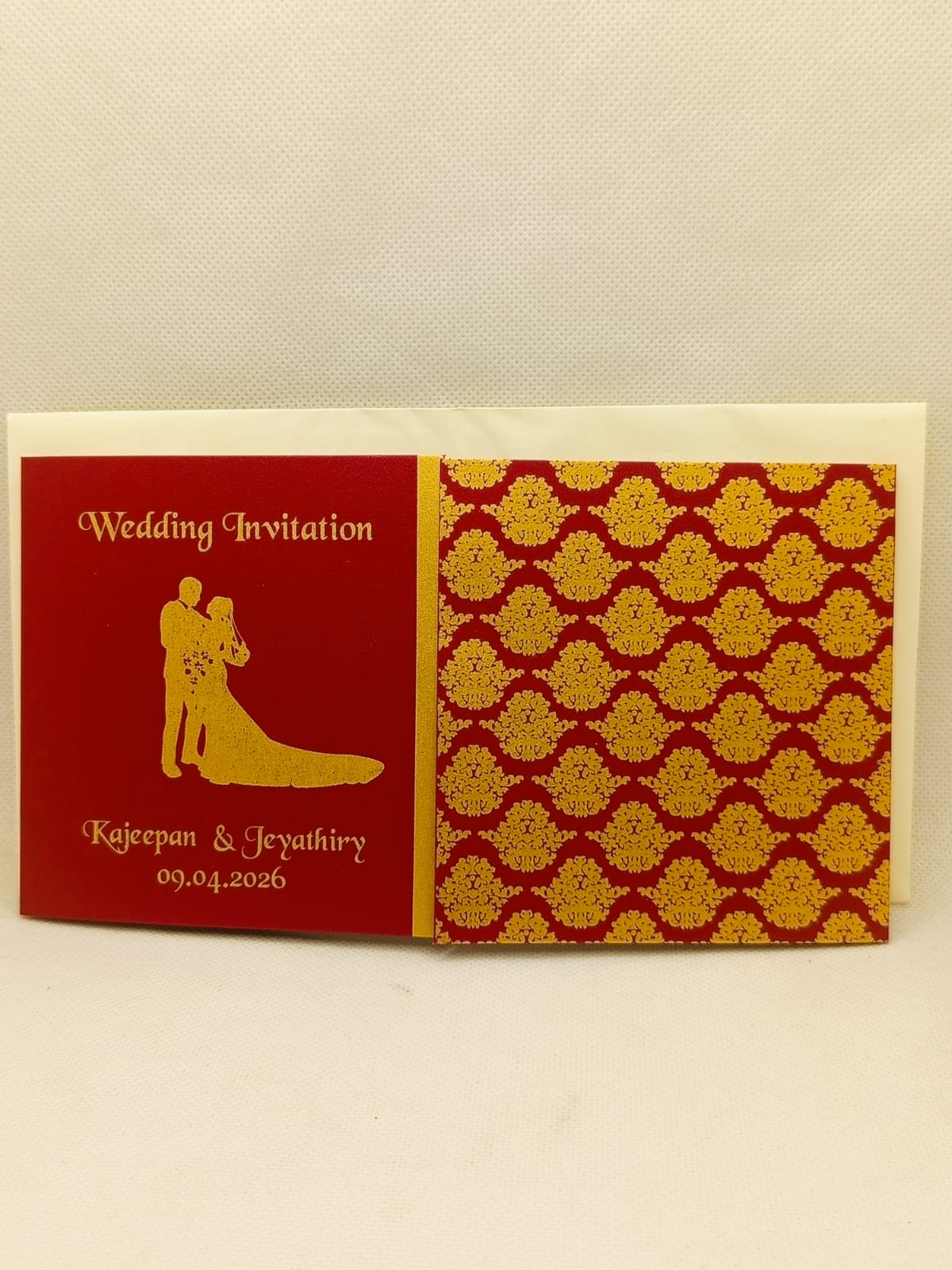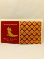 Door open small maroon colour wedding card is one of our elegant design. This invitation card is made out of maroon textured board with matching paper envelope. Card has a gold watermark design and couple logo (Please note,this logo can be changed to any symbol or couple initial as per your preference).