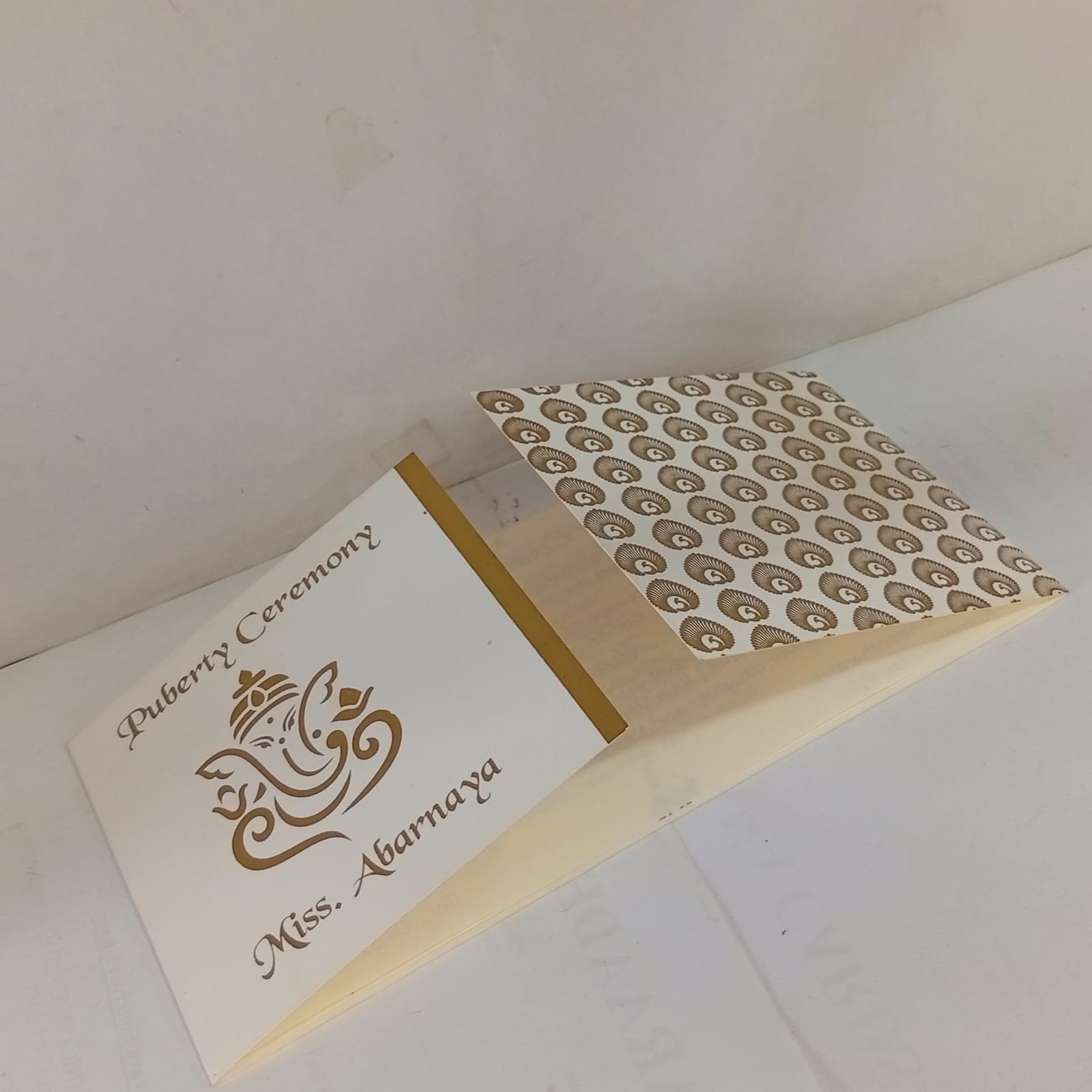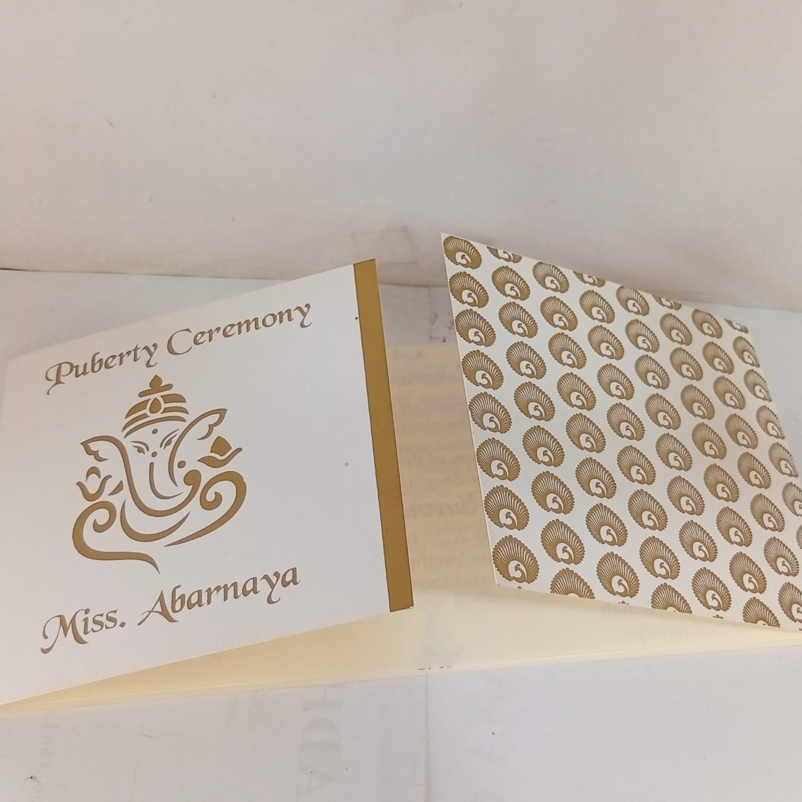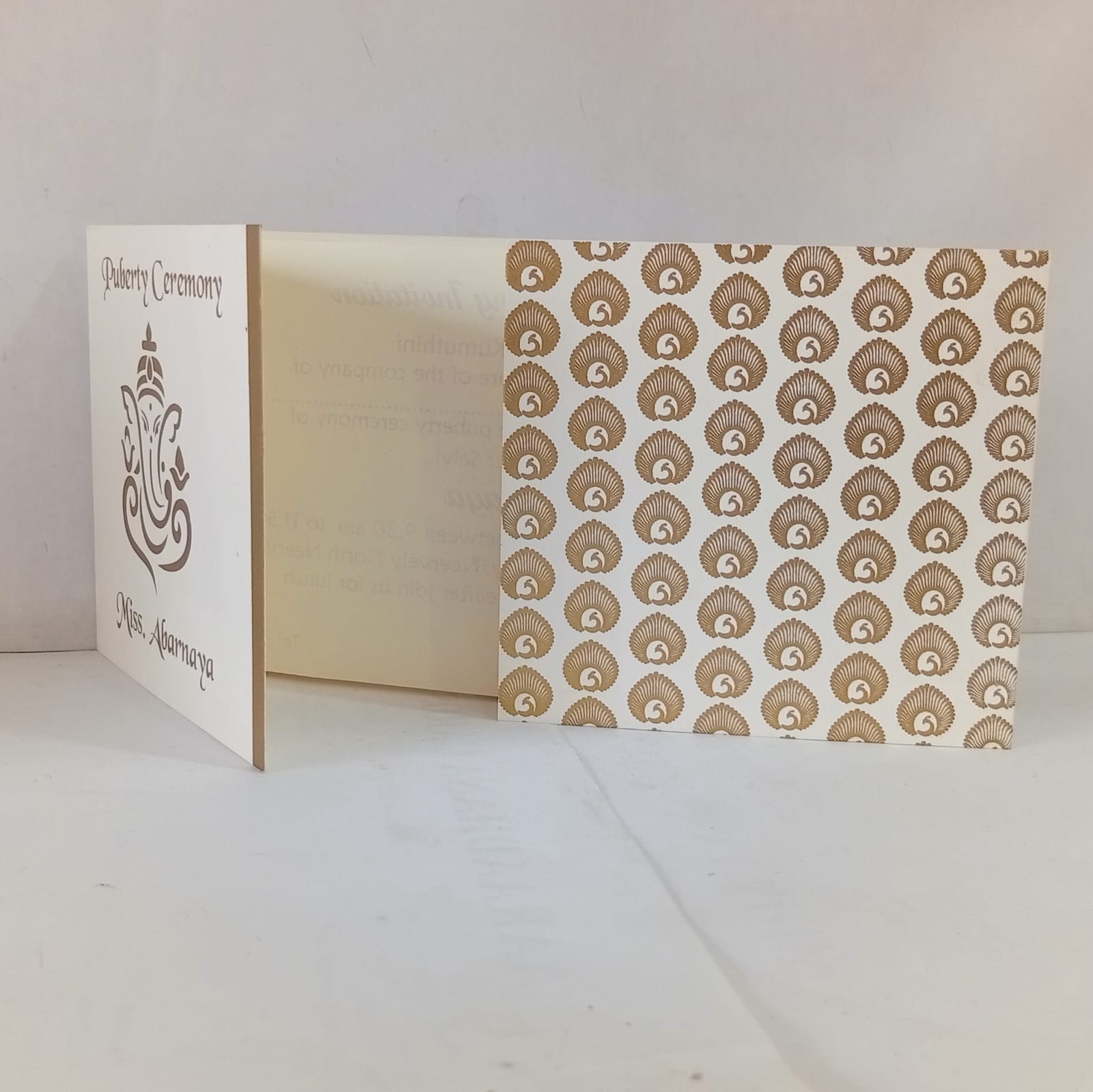 White and Gold door open small invitation is one of our elegant design. This invitation card is made out of white textured paperboard with matching mailing envelope. Card has a gold watermark design and Ganesh logo magenta ink screen print.(Please note,this logo can be changed to any symbol or couple initial as per your preference).Please choose one of the colour from our colours pallet(please check the image)for envelopes. 120gsm shimmer paper.