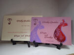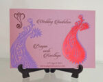 This is a simple wedding card with feathers design printed on it .