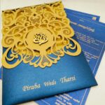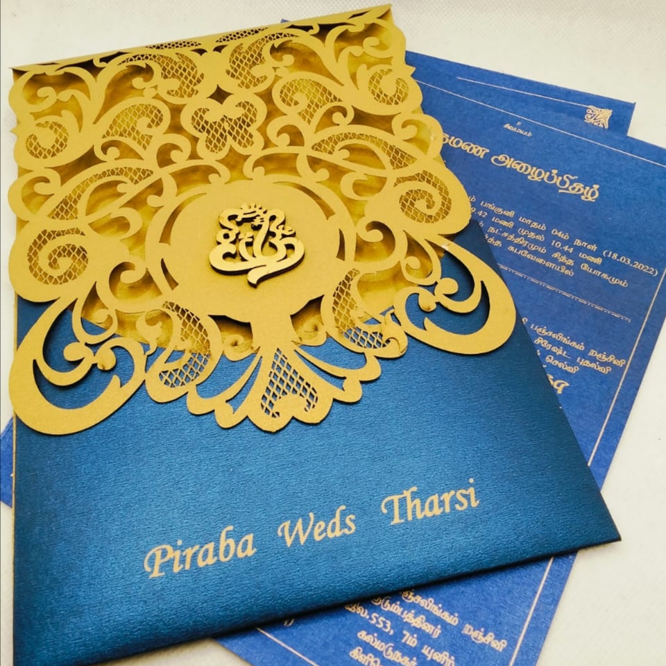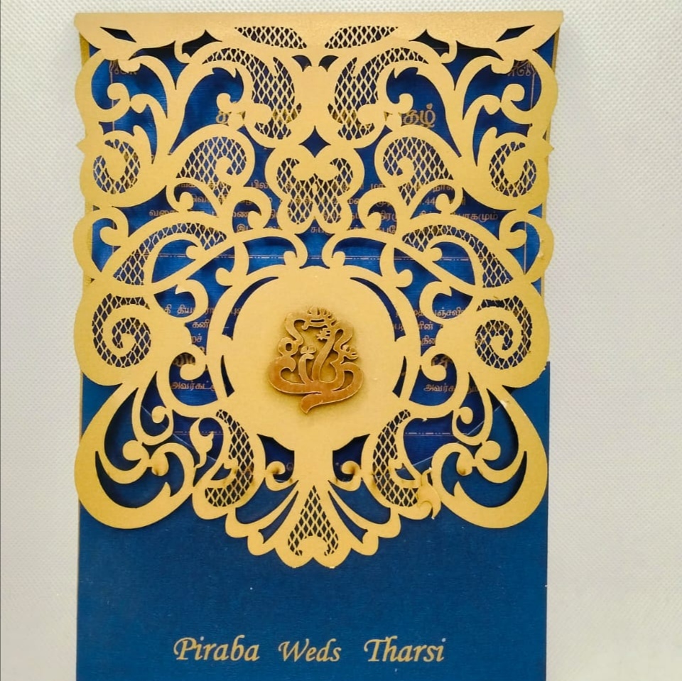 Laser cut gold and blue paisley wedding invitation is one of our elegant design. A unique laser cut invitation made from metalic thick brown paper.A tree is laser cut on the cover.Insert and envelope colours can be changed. The outer card colour also can be changed,with laser cut 3D Ganesh logo(Please note,this logo can be changed to any symbol or couple initial as per your preference).Please choose one of the colour from our colours pallet(please check the image) for envelopes.120gsm shimmer paper.