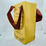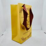 Gold colour gift bag is one of our beautiful design. These beautiful personalized gift bags are crafted out of very fine quality gold metallic card stock, with brown ribbon used as handles. The printing on this bag is brown ink.