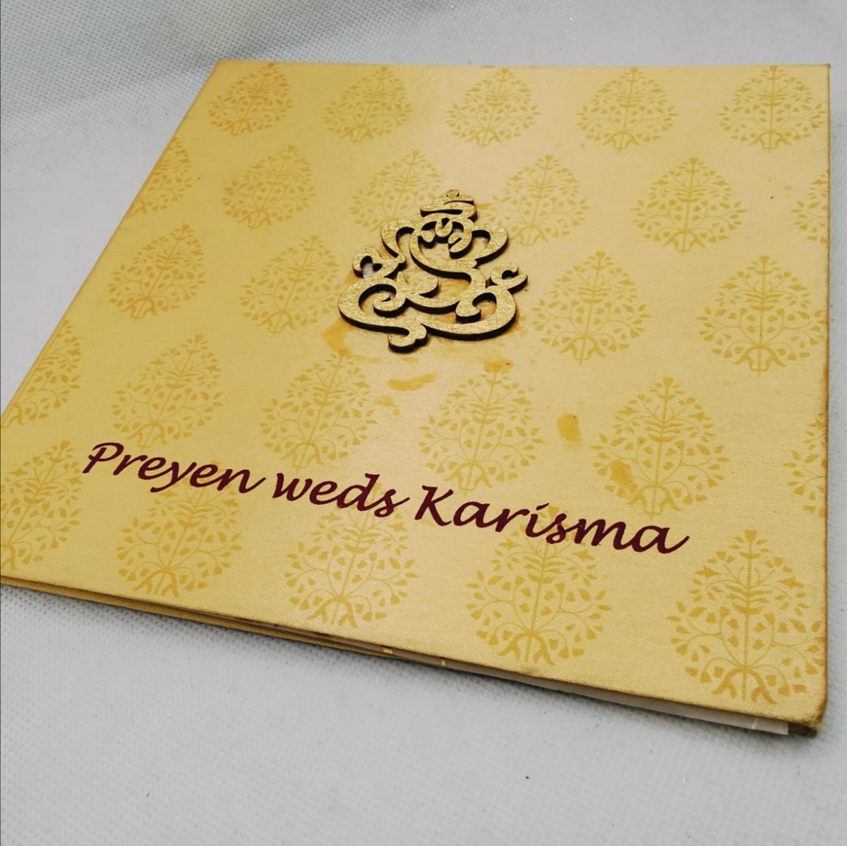 Gold satin wedding invitation card is one of our elegant design. This invitation card is made out of gold satin textured with matching box folding envelope. Card front has water marks and laser cut ganesh logo (Please note, this logo can be changed to any symbol or couple initial as per your preference). The card has Two inserts with coordinated printed designs.