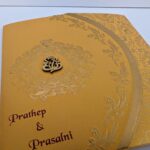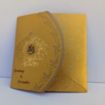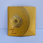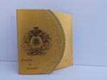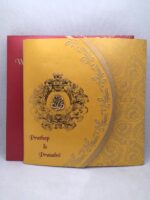 Gold with red wedding invitation new is one of our elegant designs. This invitation card is made out of Gold textured board with matching mailing envelope.Card front has a rich Gold foil printing,rich gold screen printing,Gold emboss and a foiled 3D Ganesh logo(Please note, this logo can be changed to any symbol or couple initial as per your preference).Please choose one of the colour from our colours pallet (please check the image) for envelopes. 120gsm shimmer paper. The card has two inserts with coordinated printed designs .