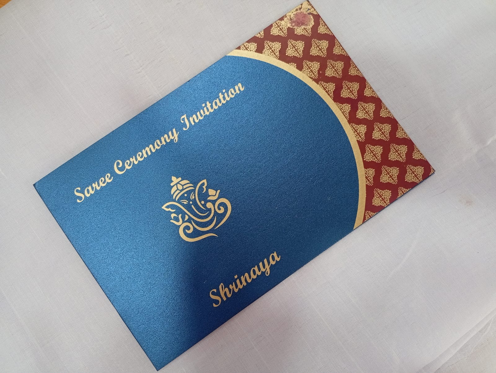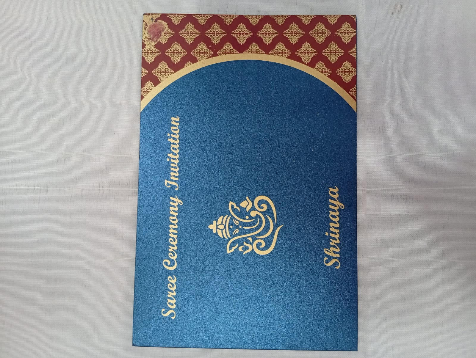 Hindu blue colour wedding invitation is one of our elegant design. This invitation card is made out of blue textured metallic board with matching paper envelope. Card front has a water mark design and ganesh logo (Please note, this logo can be changed to any symbol or couple initial as per your preference). The card has two inserts with coordinated printed designs.