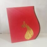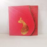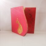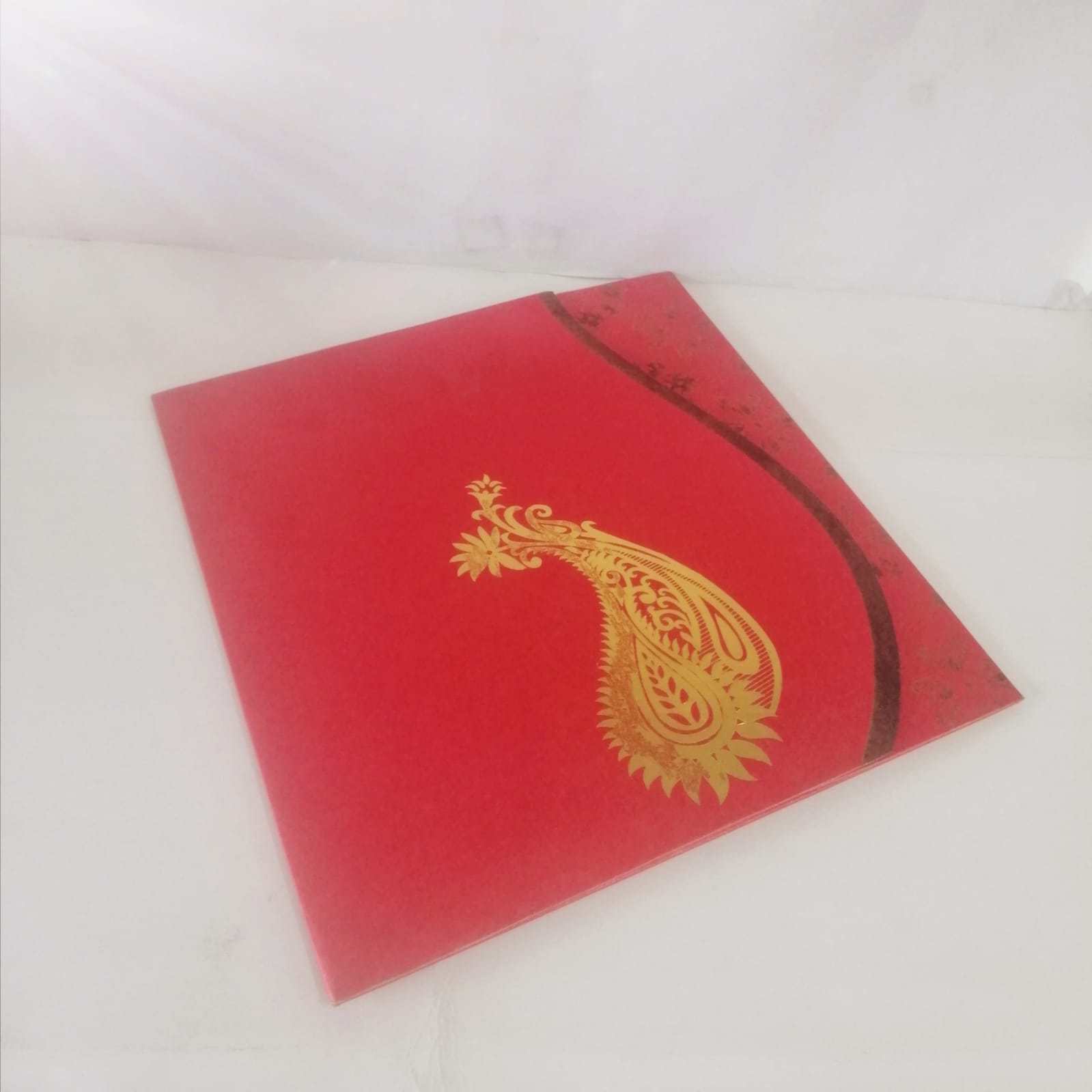 Indian paisley wedding invitation is one of our elegant designs.This invitation card is made out of  red  textured paperboard with matching mailing envelope.Card has a  rich gold paisley and other design foiled and screen printing.The card has two inserts with coordinated printed design.Please choose one of the colour from our colours pallet (please check the image)for envelopes.120gsm shimmer paper.