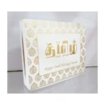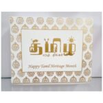 Cream with Gold design snack box is one of the cutest that we produce.This snack box is made out of off cream matt paperboard.Snack box top has a design and couple name printed in Gold ink.