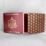 Maroon door open small invitation is one of our elegant designs. This invitation card is made out of maroon textured paperboard with matching mailing envelope.Card has a Gold watermark design and 3D Ganesh logo Gold ink screen print.(Please note, this logo can be changed to any symbol or couple initial as per your preference).Please choose one of the colour from our colours pallet (please check the image) for envelopes.120gsm shimmer paper.