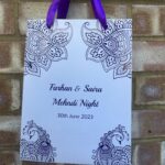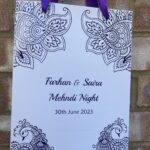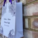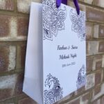 Mehndi bag – white and purple colour Gift bag is one of our beautiful designs. These beautiful personalized gift bags are crafted out of very fine quality shimmery white metallic card stock, with purple rope used as handles and with orange ink design. Text and design printed on the bag is totally customizable. Hence the price reflects the luxury finishing.