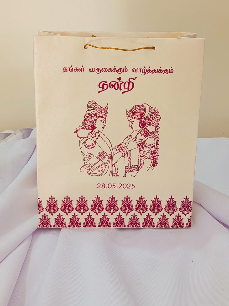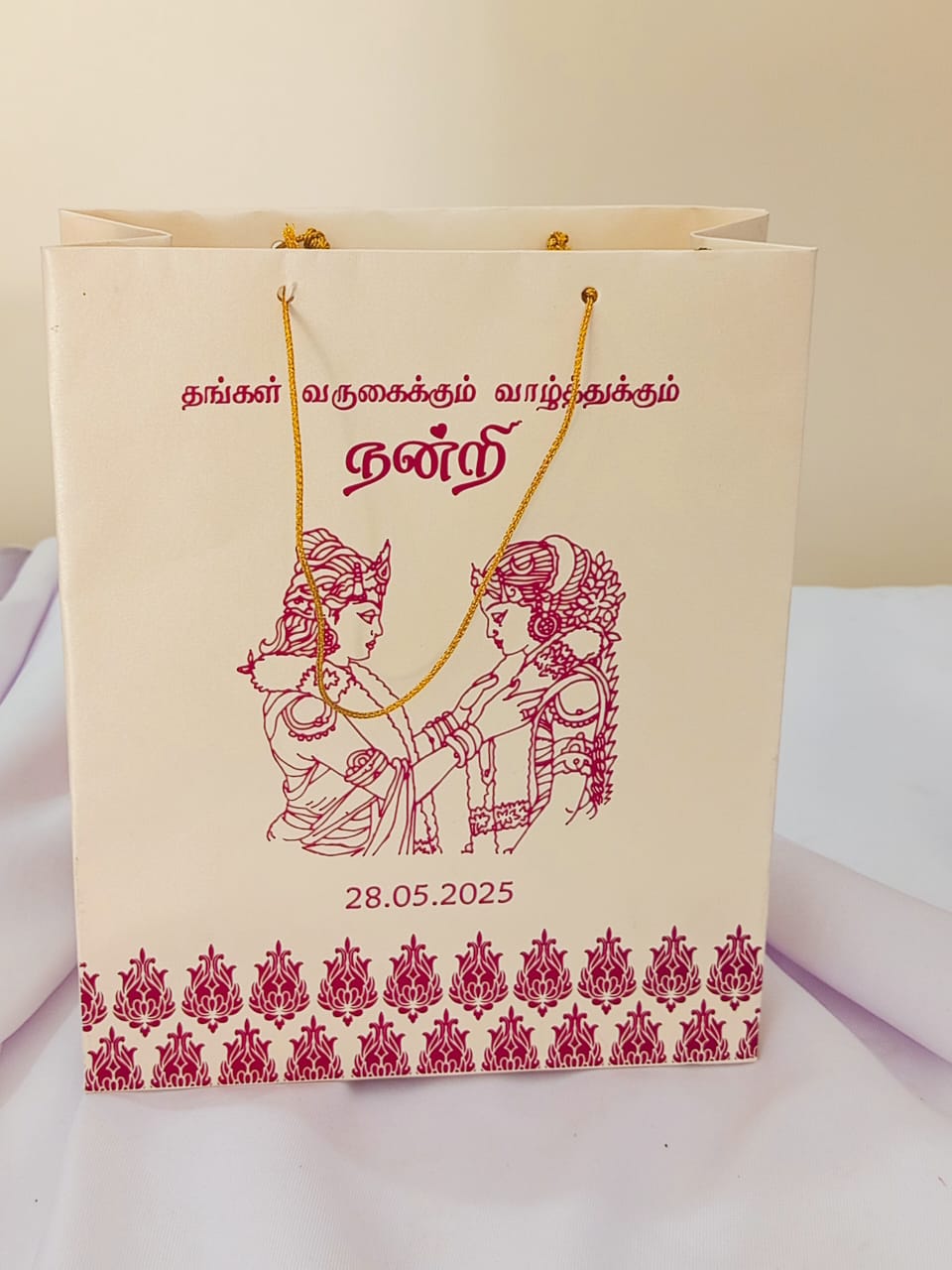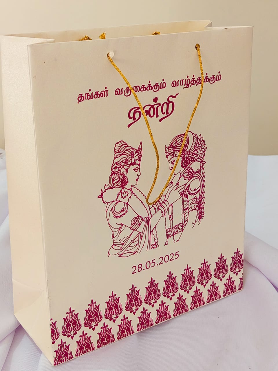 Gift bag – Cream and maroon colour Gift bag is one of our beautiful design. These beautiful personalized gift bags are crafted out of very fine quality shimmery cream metallic card stock,with maroon ink design. Text and design printed on the bag is totally customizable. Hence the price reflects the luxury finishing.