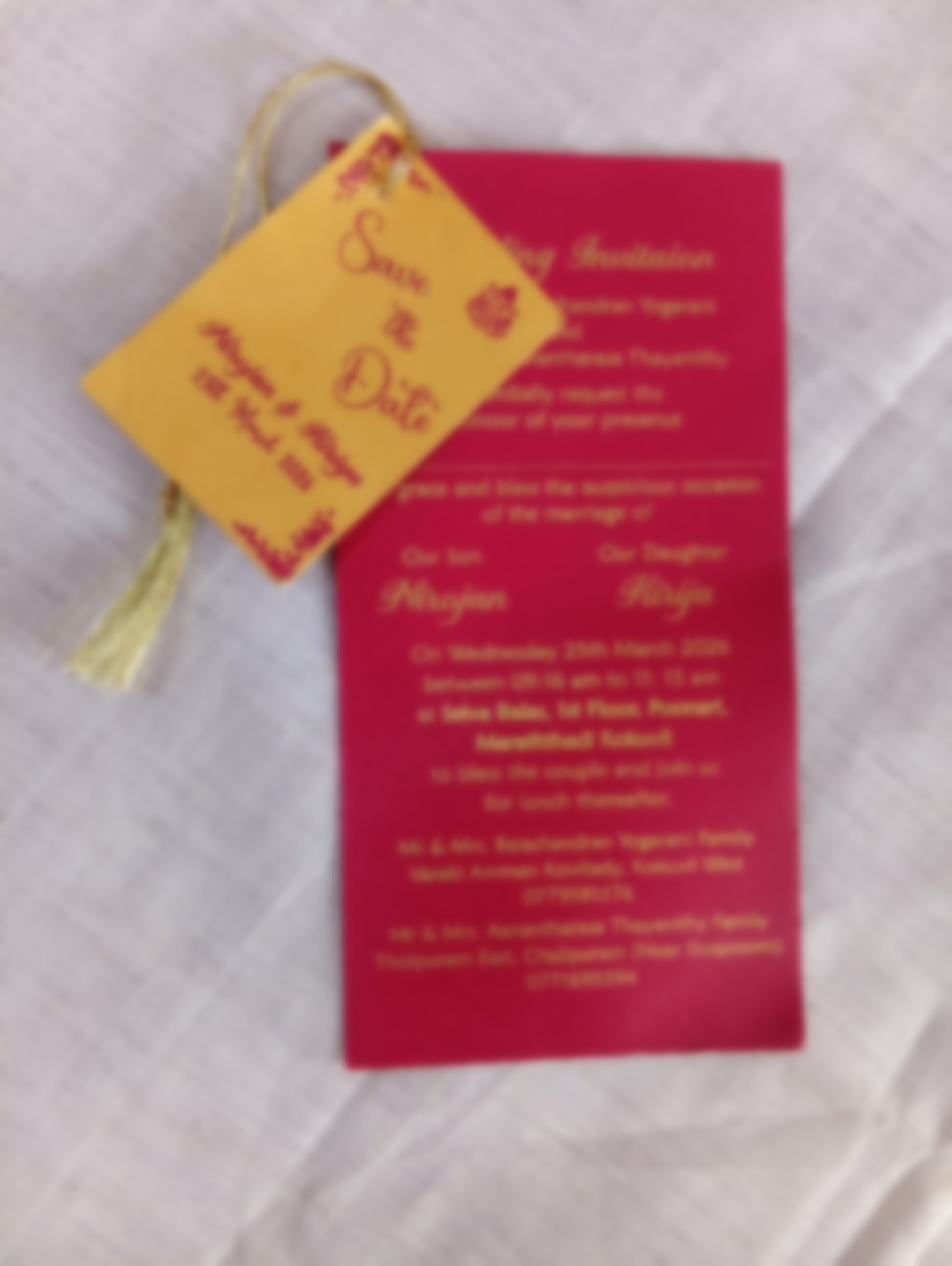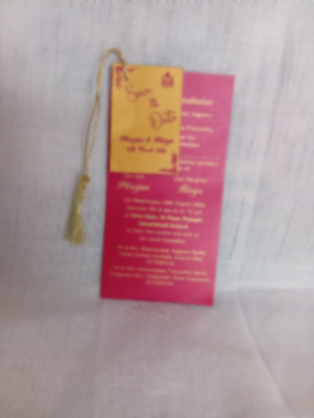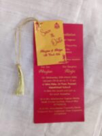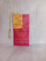 New tag model wedding invitation is one of our elegant design. This invitation card is made out of maroon and gold textured paperboard without envelope. Card has a three insert with coordinated printed designs. (Please note, this logo can be changed to any symbol or couple initial as per your preference). The card has three inserts with coordinated printed designs.