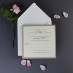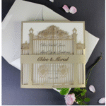 Ornamental Gate Laser wedding invitation with intricate laser cutting.The card is fine laser cut with almost precision with pearled ivory card monogram belly band add the personalised luxurious touch to your wedding.
