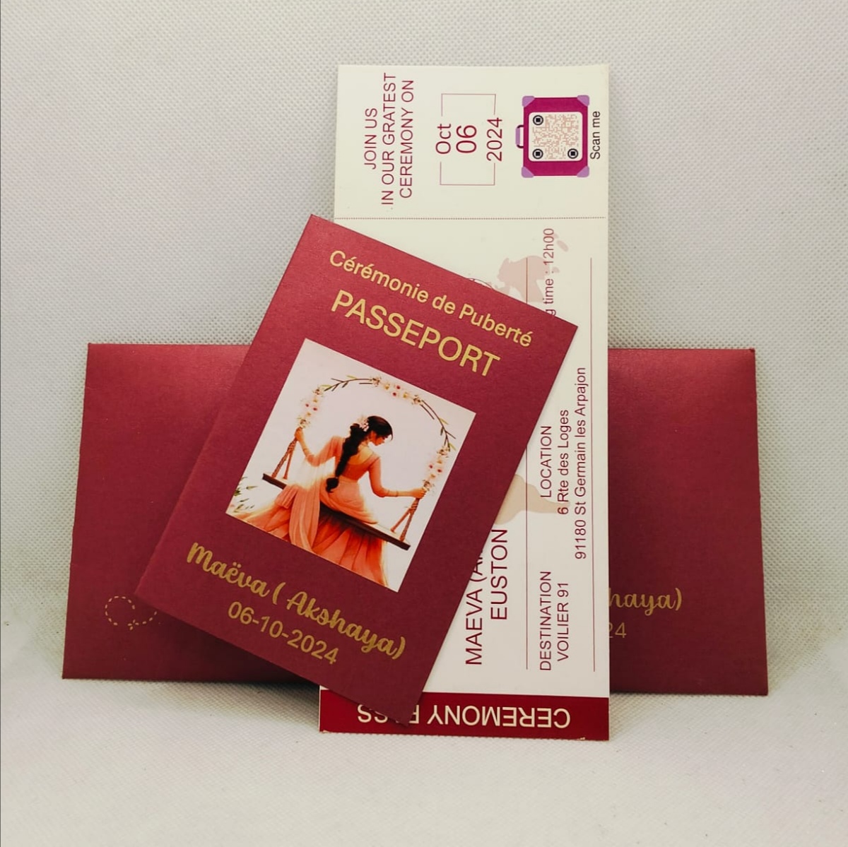 Passport wedding card invitation is one of our creative design. This invitation card is made out of maroon textured paperboard with matching mailing envelope.