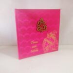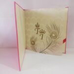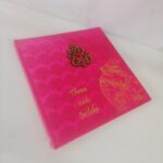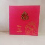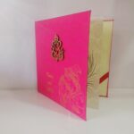 Pink satin wedding invitation is one of our elegant designs. This invitation card is made out of Pink textured paperboard with matching mailing envelope. Card has damask water mark design printed on satin with foiled Rathe Krishna, Couple name and a ganesh laser cut logo(Please note, this logo can be changed to any symbol or couple initial as per your preference).Please choose one of the colour from our colours pallet(please check the image)for envelopes.250gsm shimmer paper.The card has two inserts with coordinated printed design.