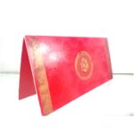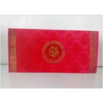 Red and two side design wedding invitation is one of our elegant designs.This invitation card is made out of Red textured metallic board with matching mailing envelope. Card two side rich Gold design and a Ganesh logo(Please note,this logo can be changed to any symbol or couple initial as per your preference).Please choose one of the colour from our colours pallet(please check the image)for envelopes. 120gsm shimmer paper.The card has two inserts with coordinated printed designs.