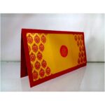 Red & Gold wedding invitation is one of our elegant designs. This invitation card is made out of red textured paperboard with matching mailing envelope.Card has a damask design and 3D Ganesh logo(Please note,this logo can be changed to any symbol or couple initial as per your preference).Please choose one of the colour from our colours pallet(please check the image)for envelopes.120gsm shimmer paper.The card has inserts with coordinated printed designs.