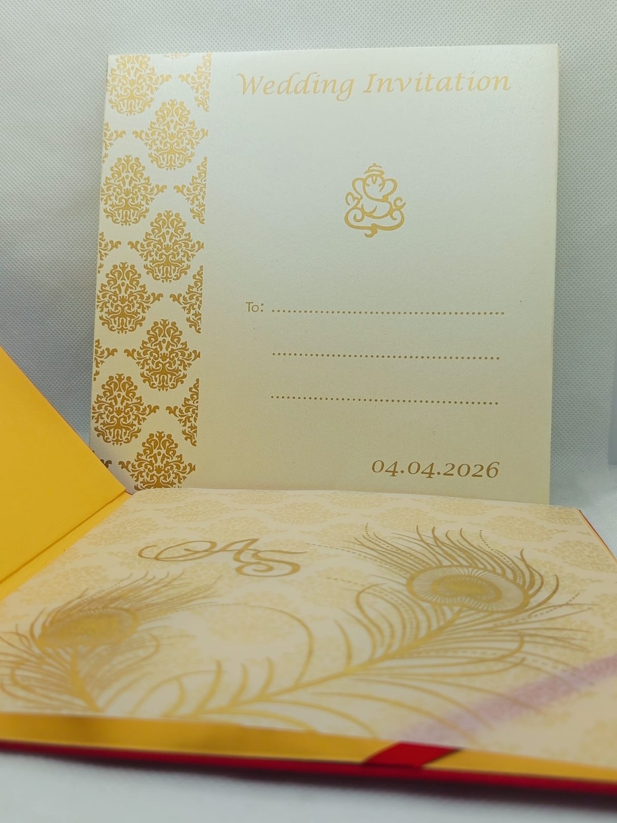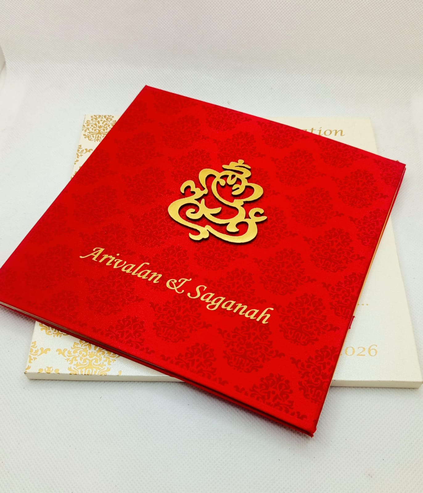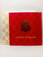 Red wedding invitation is one of our elegant design. This invitation card is made out of red textured board & satin material with matching cream color mailing envelope. Card has damask water mark design printed and ganesh logo.(Please note, this logo can be changed to any symbol or couple initial as per your preference). The card has two inserts with coordinated printed design.
