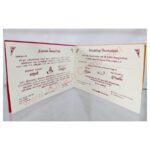 Red with Gold foiling card wedding invitation is one of our elegant design. This invitation card is made out of maroon textured paperboard with matching mailing envelope. Card has bride & Groom design with foiled , Cover design with logo (Please note, this logo can be changed to any symbol or couple initial as per your preference). Please choose one of the colours from our colour pallet (please check the image) for envelopes. 120gsm shimmer paper. The card has Two inserts with coordinated printed design.