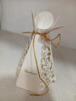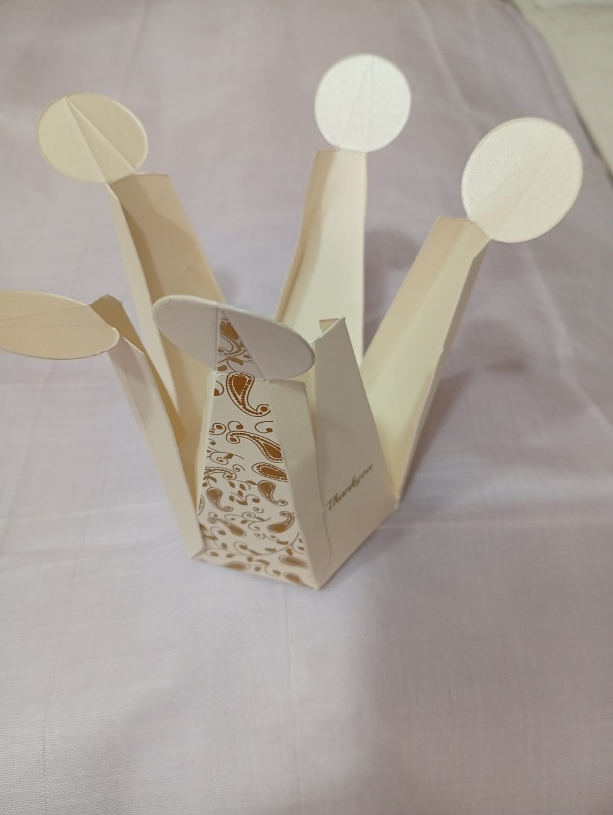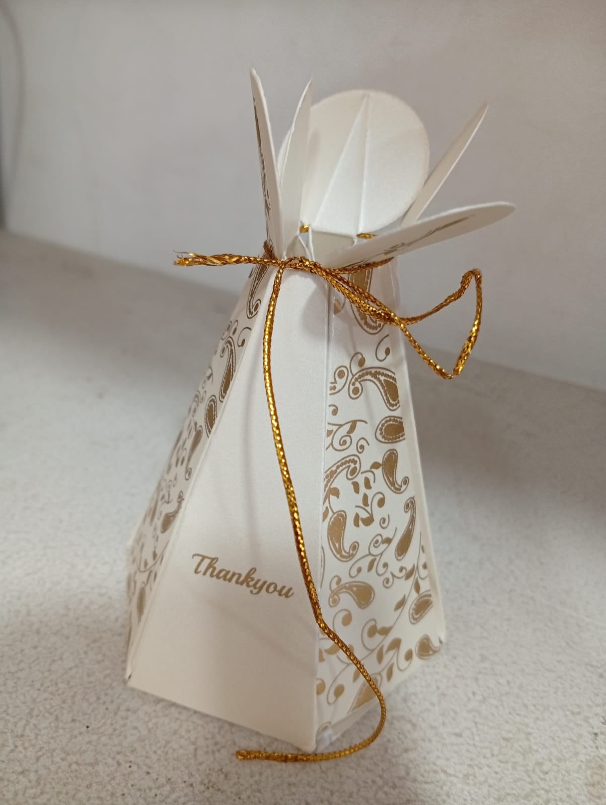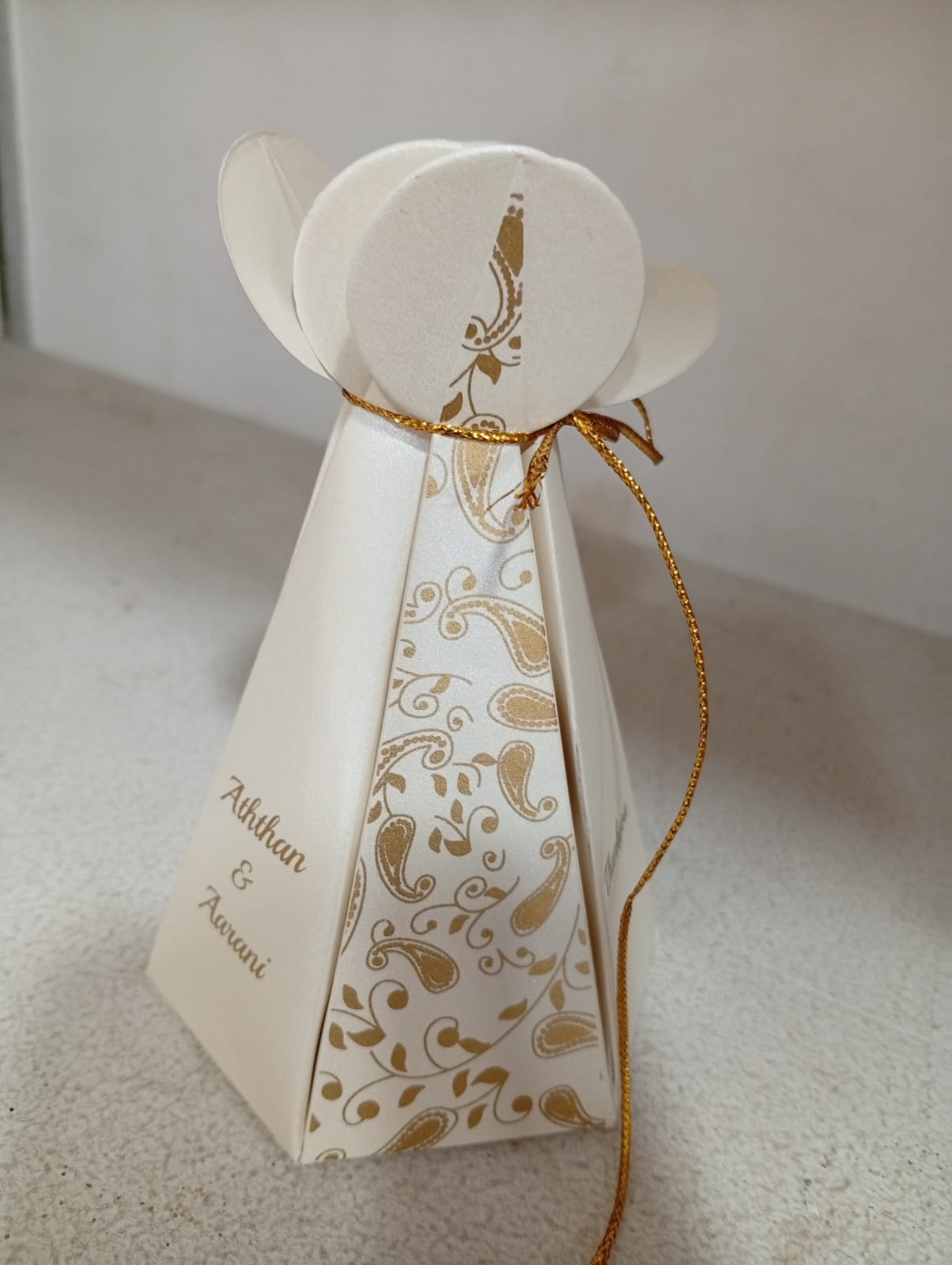 Rich wedding cake box is one of the cutest  that we produce. This cake box is made out of white textured paperboard. Cake box front has a gold ink mango paisley patterns on alternate faces.