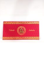 Gold foil and Red satin wedding invitation is one of our elegant designs.The invitation card is made out of high-quality Red satin silk material and metallic board with matching mailing box envelope and coordinated inserts inside.Card front has a beautiful golden Vinayagar initials laser-cut(Please note,this logo can be changed to any symbol or couple initial as per your preference)designed for specifications with the rich style of the side opening.Card front also has watermark style prints and Gold foil this card is fully customizable to suit your theme colour.This card has two inserts with coordinated printing designs.