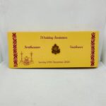 Scroll wedding invitation one of our elegant design. This invitation card is made out of Gold textured board. Card front has a rich maroon ink Print and laser cut ganesh logo (Please note,this logo can be changed to any symbol or couple initial as per your preference). The card has velvat cloth inserts with coordinated printed design.