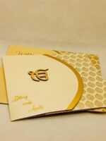 Sikh design wedding invitation is one of our elegant design. This invitation card is made out of gold textured paperboard with matching shimmer envelope. Card front has a sikh symbol logo with gold water mark design. (Please note, this logo can be changed to any symbol or couple initial as per your preference). The card has two inserts with coordinated printed designs.