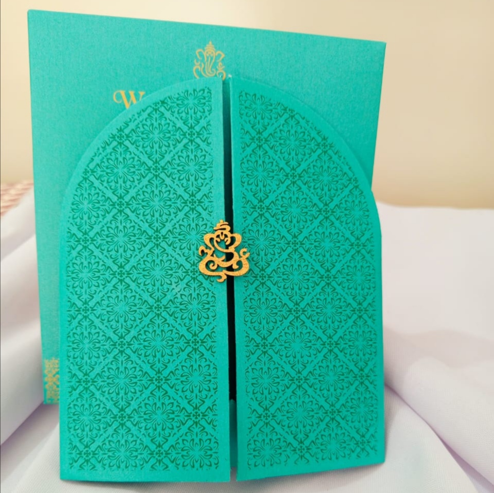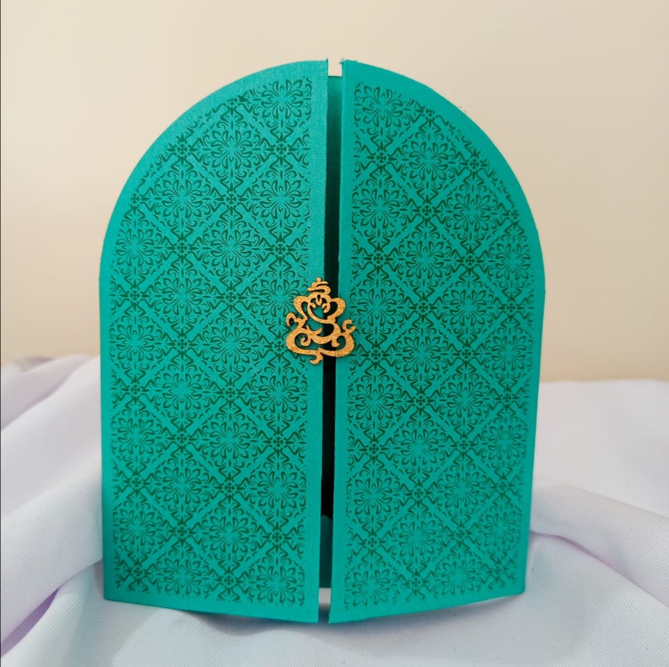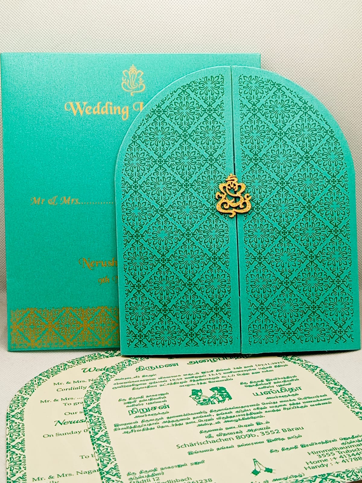 Temple door design wedding invitation is one of our elegant design. This invitation card is made out of  Green textured paperboard with matching green mailing envelope. Card has a damask design water mark and  laser cut Ganesh logo(Please note, this logo can be changed to any symbol or couple initial as per your preference). The card has two inserts with coordinated printed design. Please choose one of the colour from our colours pallet (please check the image)for envelopes. 120gsm shimmer paper.