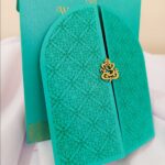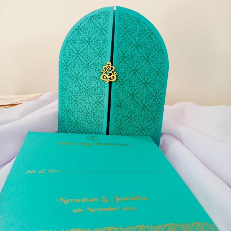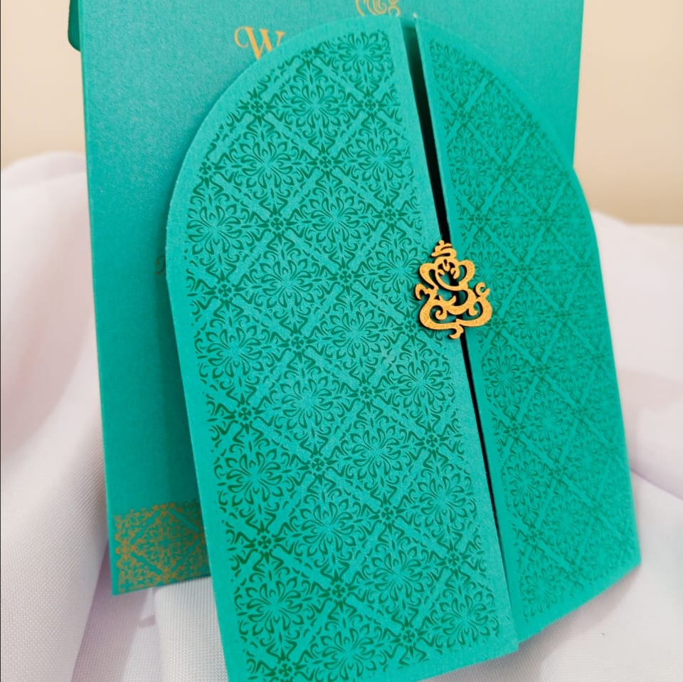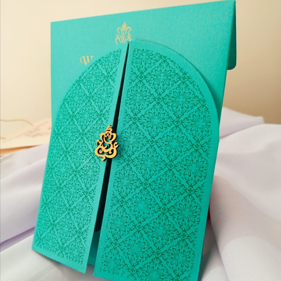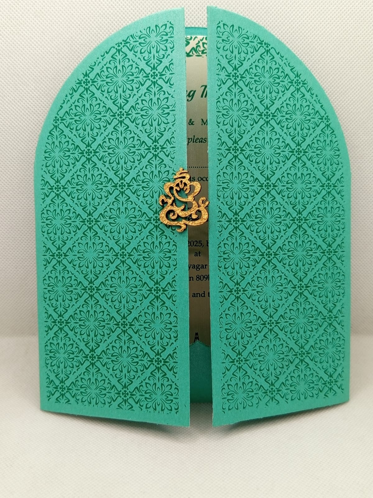Temple door design wedding invitation is one of our elegant design. This invitation card is made out of  Green textured paperboard with matching green mailing envelope. Card has a damask design water mark and  laser cut Ganesh logo(Please note, this logo can be changed to any symbol or couple initial as per your preference). The card has two inserts with coordinated printed design. Please choose one of the colour from our colours pallet (please check the image)for envelopes. 120gsm shimmer paper.