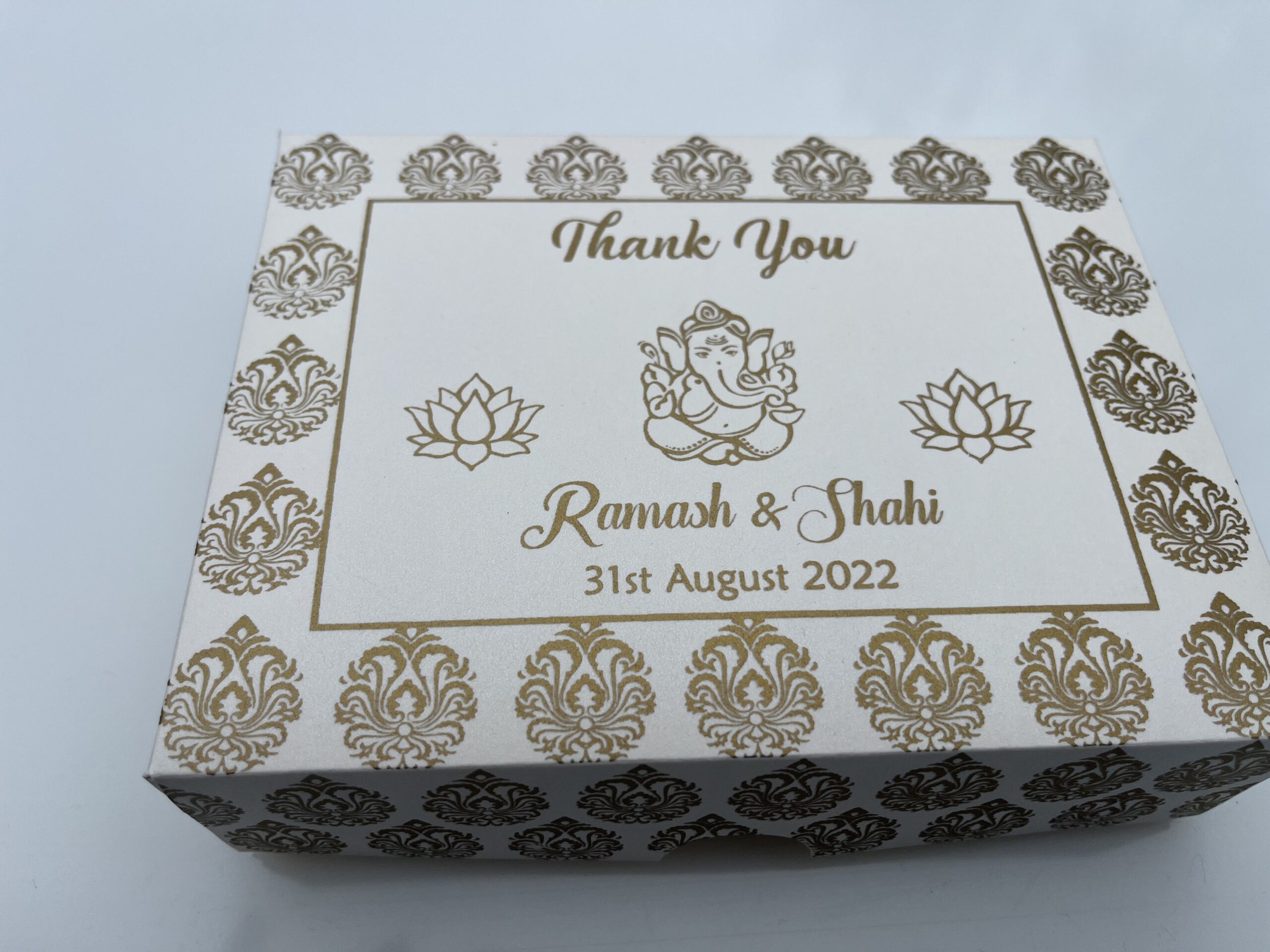 Top and bottom style snack box is one of the beautiful design. This snack box is made out of cream shimmer board. Snack box top has a lotus and ganesh logo desig and couple name printed in gold ink.